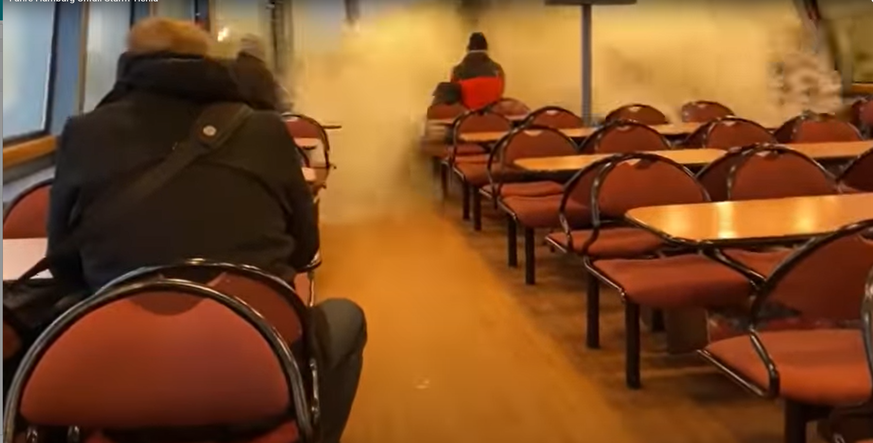 Passagiere laufen panisch davon Riesenwelle zerschmettert. Das Schiff geriet aufgrund des Sturmtiefs Ylenia in Höhe Finkenwerder in heftigen Seegang hohe Wellen schlugen auf die Fenster. Im Sturm kam es zu einem massiven Wassereinbruch.